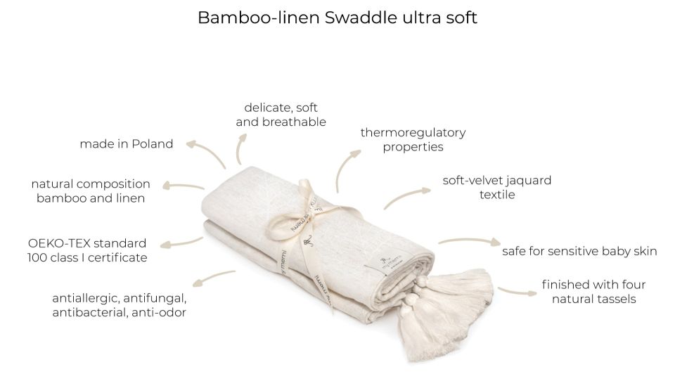 Textile properties: - antibacterial and antifungal, anti-odor, hypoallergenic, so it does not cause allergic reactions and relieves skin diseases symptoms - it absorbs water around 60 % more effectively than cotton and blocks Ultraviolet rays (UV), - bamboo grows without pesticides or chemical fertilisers, - our textile is proven to be free from any pollution, - it has thermoregulatory properties, keeps cool during hot days and warm in cold ones, - our Bamboo- Linen Swaddle Blanket is fully biodegradable and it does not pick up static.