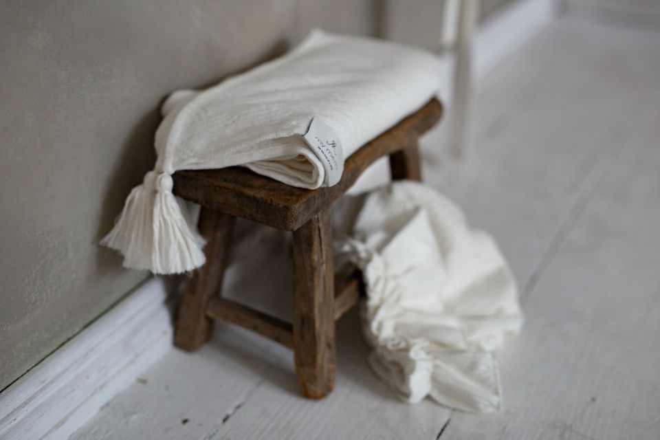The product is distinguished by its timeless design matching the boho style. The structural bamboo fabric of the swaddle was decorated with a delicate pattern and finished with four natural tassels.