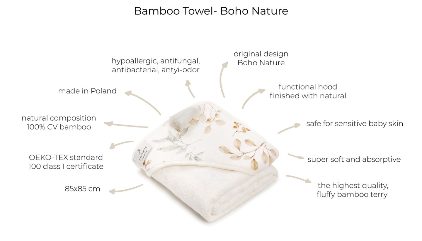 Hooded baby towel with a design from Boho Nature collection. Product equipped with a suspender that can be easily worn by the parent what makes the daily care much easier. Cuddled immediate after a bath, the baby feels a sense of secure and closeness.