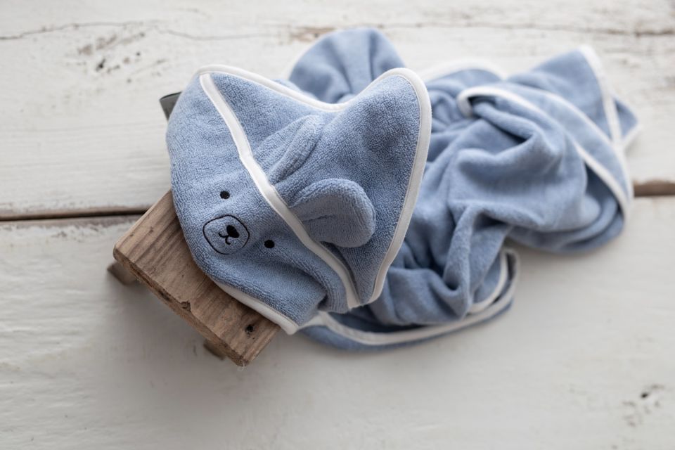 Hooded baby towel designed with a pair of adorable ears. Product equipped with a suspender that can be easily worn by the parent what makes the daily care much easier. Cuddled immediate after a bath, the baby feels a sense of secure and closeness.